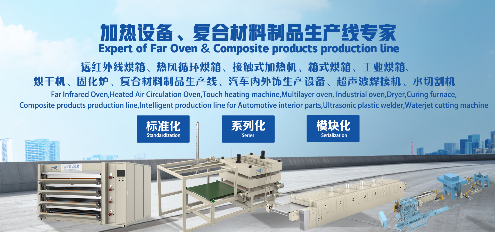 The following fields are covered: Far Infrared Oven, Heated Air Circulation Oven,Industrial oven,Curing furnace,Multilayer oven, Touch type heater,Multi-layer touch type heater,PET composite products intelligent production line,LWRT (lightweight reinforced thermoplastics) intelligent production line, GMT (glass mat reinforced thermoplastics) intelligent production line,LFT (long fiber reinforced thermoplastics) intelligent production line, Intelligent heating production line for Automobile carpet, Intelligent heating production line for Automobile ceiling, Intelligent heating production line for automobile wheel cover, Intelligent heating production line for Automotive interior parts,New energy vehicle battery cover and lower shell intelligent production line, SMC composite products intelligent production line,HP-RTM /HP-CRTM composite products intelligent production line,Intelligent heating production line for composite products, Ultrasonic plastic welding machine, Hot plate welding machine,Teflon strip composite machine, Steel strip composite machine, Felt sheet composite machine, Heating equipment supporting automation equipment, Such as truss loading manipulator and frame loading manipulator, Automatic up and down feeding machine, Spreading Machine, Automatic loading and unloading by robot, Gripper, Acupuncture group, Lorry, Air motor return device, Elevation structure etc.